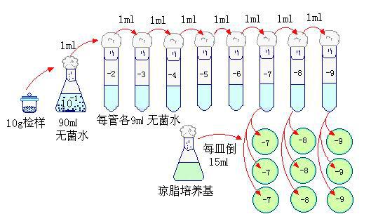 3)、另取1ml滅菌吸管,按上項(xiàng)操作順序,制10倍遞增稀釋液,如此每遞增稀釋一次即換用1支1ml滅菌吸管。